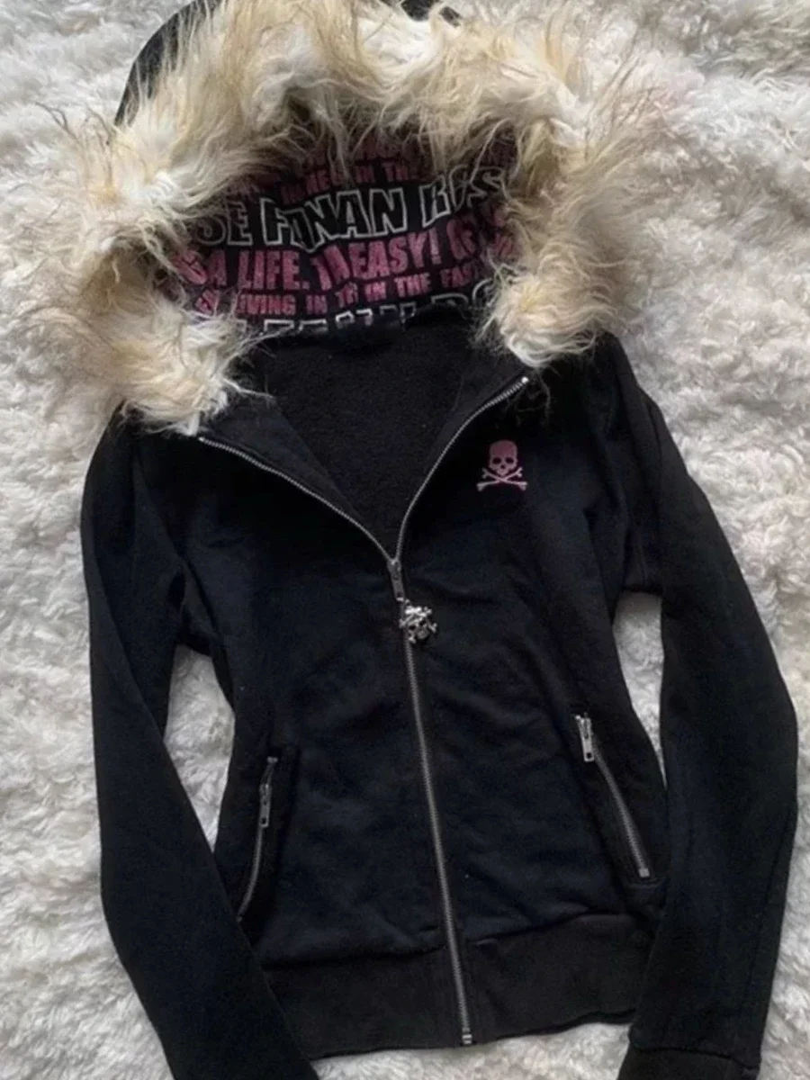 Y2K Black Fur Collar Zipper Sweatshirt Hoodie Sexy Women Sweatshirt Harajuku Goth Letter Graphic Print Slim Coat Winter Clothes